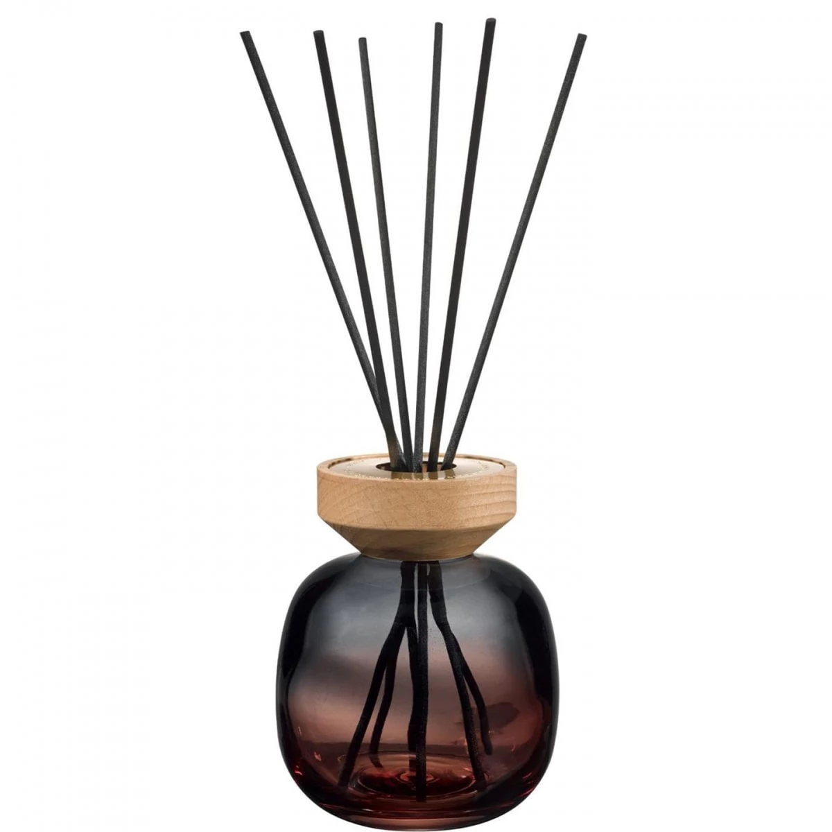 Son flacon en verre dégradé gris et rouge et sa bague en bois clair élégante offrent une esthétique raffinée et originale.