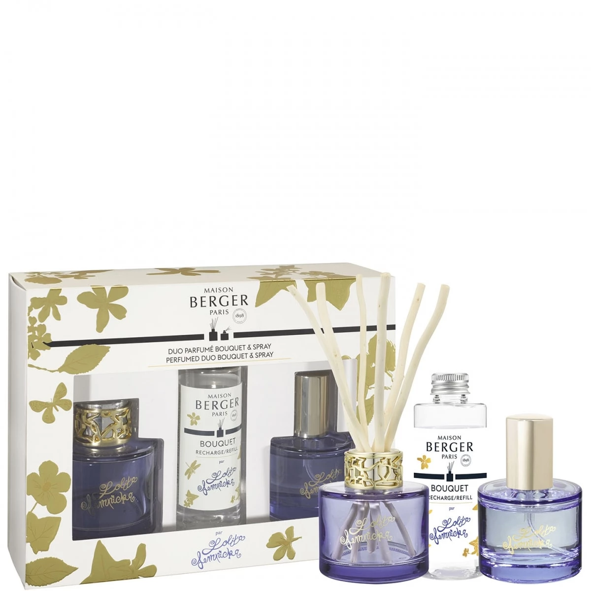 Sur le Bouquet et le Spray, le verre transparent laisse apparaître les motifs dorés du nom Lolita Lempicka.