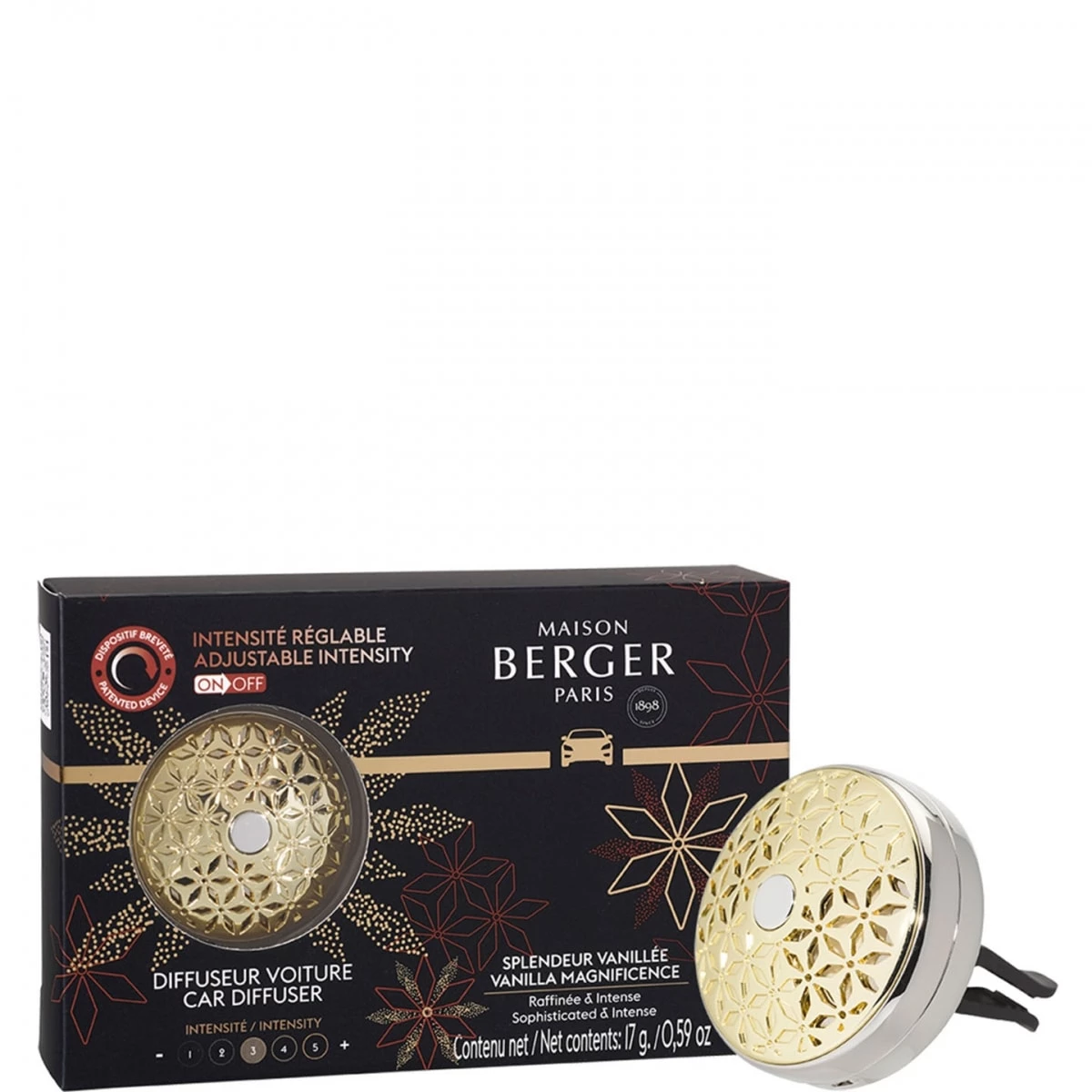 Le diffuseur voiture de la collection Pomelis et son décor doré y apportent une touche déco et s'accompagnent de recharges au parfum de la collection : Splendeur Vanillé.