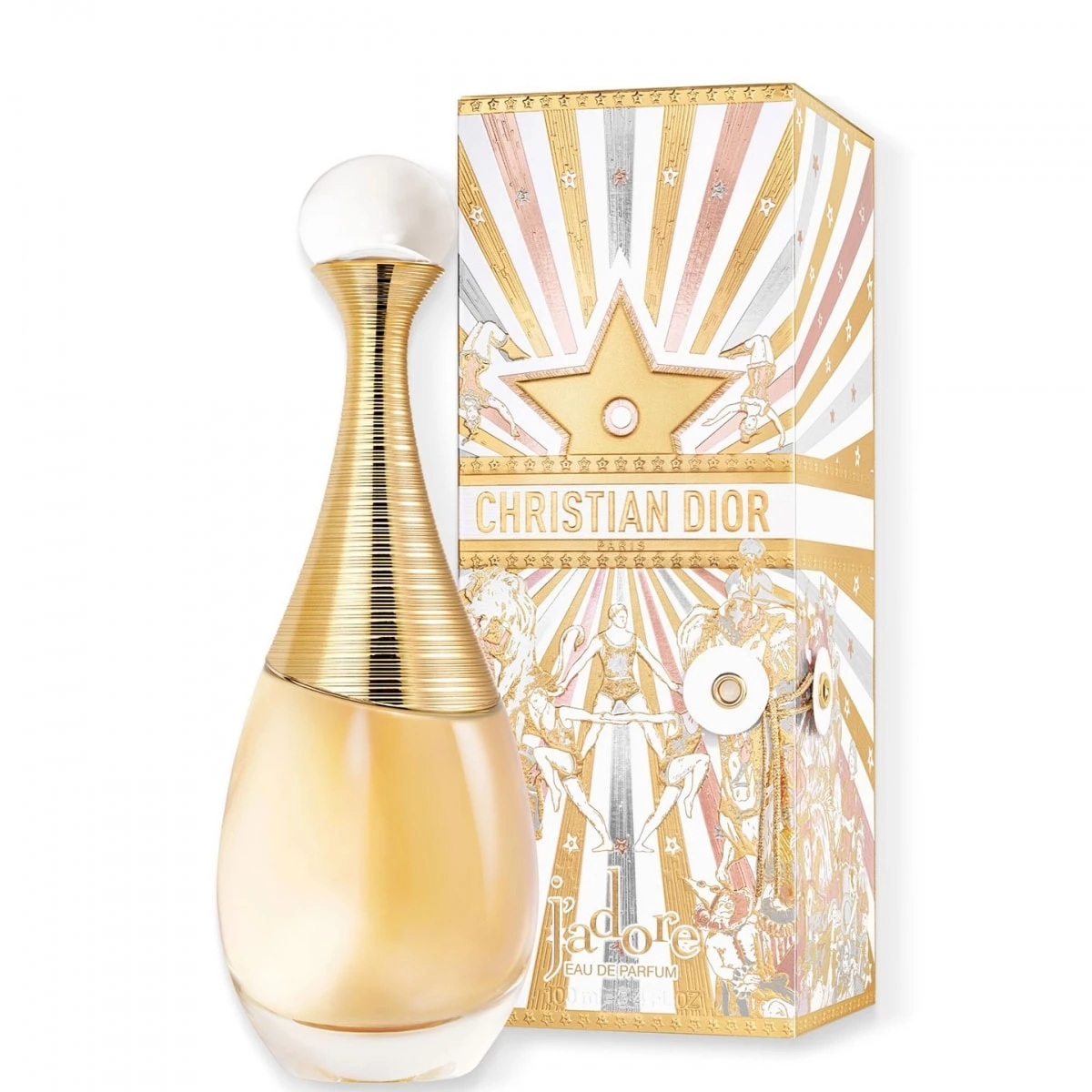 Pour les fêtes de fin d'année, J'adore Eau de Parfum se métamorphose en une idée cadeau sublime : autour du parfum, se déploie un univers onirique orné de l'étoile porte-bonheur de Monsieur Dior et d'une fresque de personnages inspirés de l'univers coloré et festif du cirque qu’il affectionnait tant.