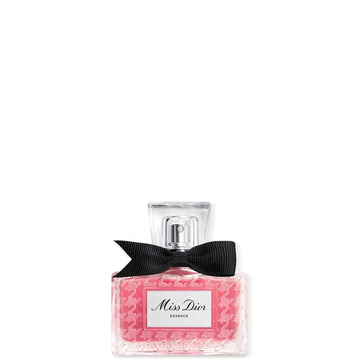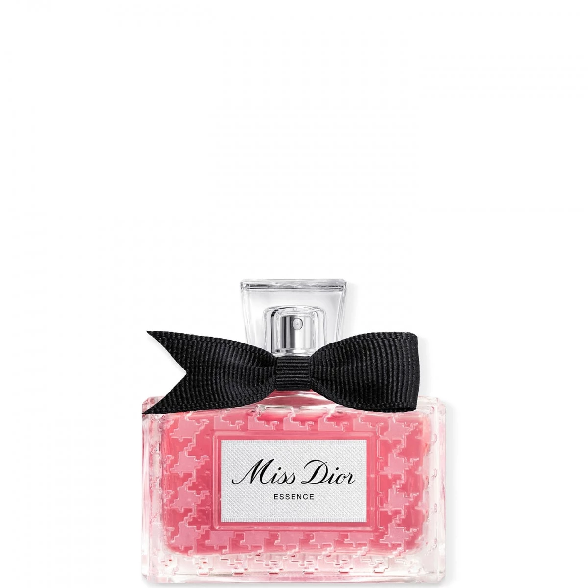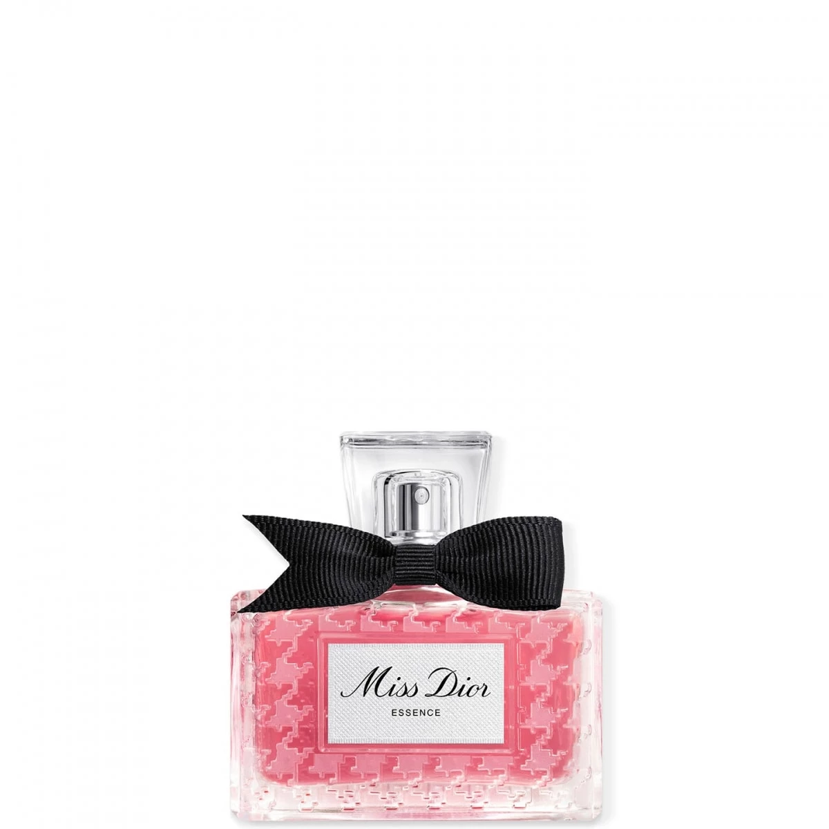 Miss Dior Essence s'affirme tout en renouant avec son identité originelle, réinterprétant le flacon patrimoine imaginé en 1948 par Christian Dior : un motif pied-de-poule givré ainsi qu'un nœud poignard de gros grain noir fabriqué en France, qui habille une précieuse coiffe en verre.