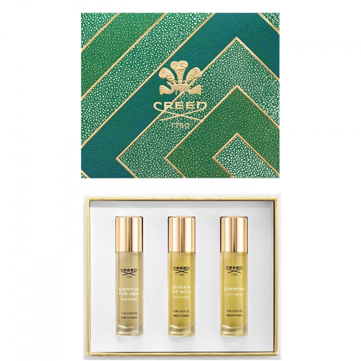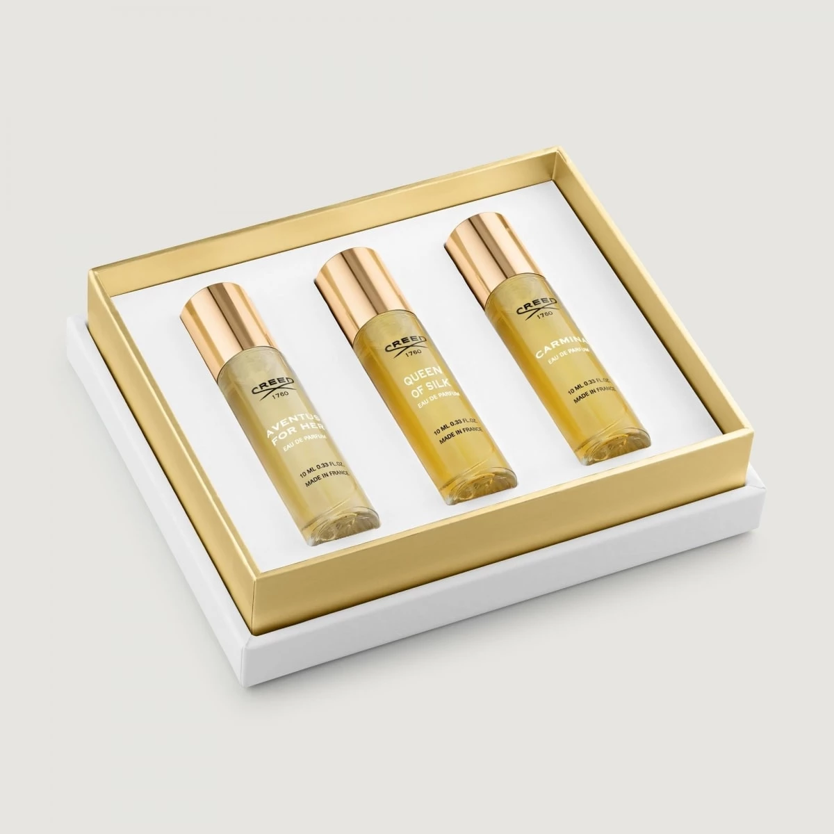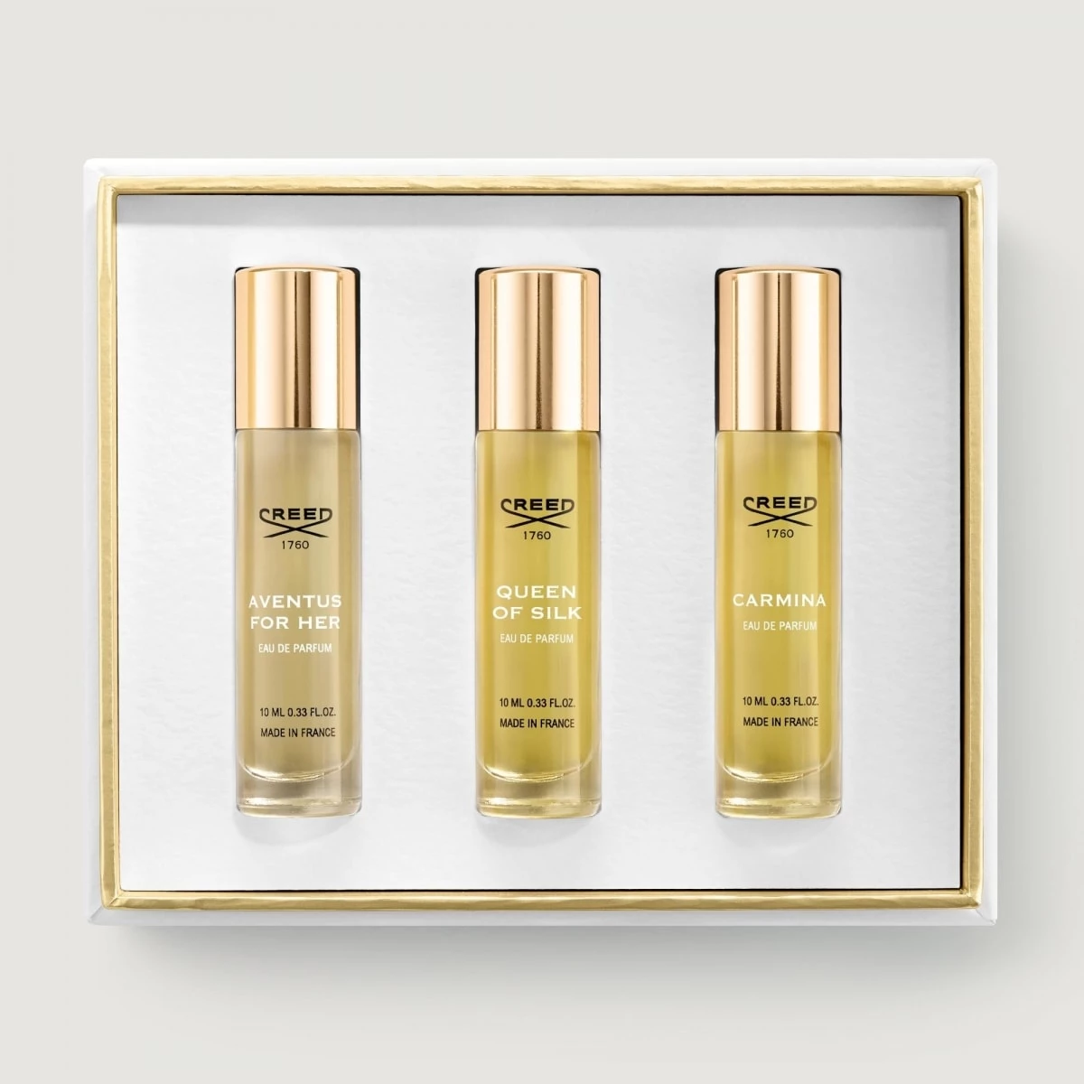 Ce coffret en édition limitée réunit trois hommages distinctifs à la féminité moderne : Aventus For Her, Carmina et Queen of Silk, trois éditions raffinées de 10 ml, parfaites pour la découverte, le voyage ou les cadeaux attentionnés.