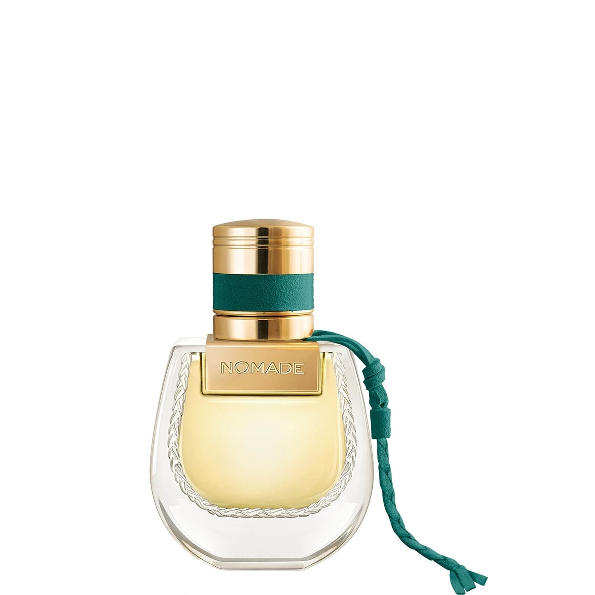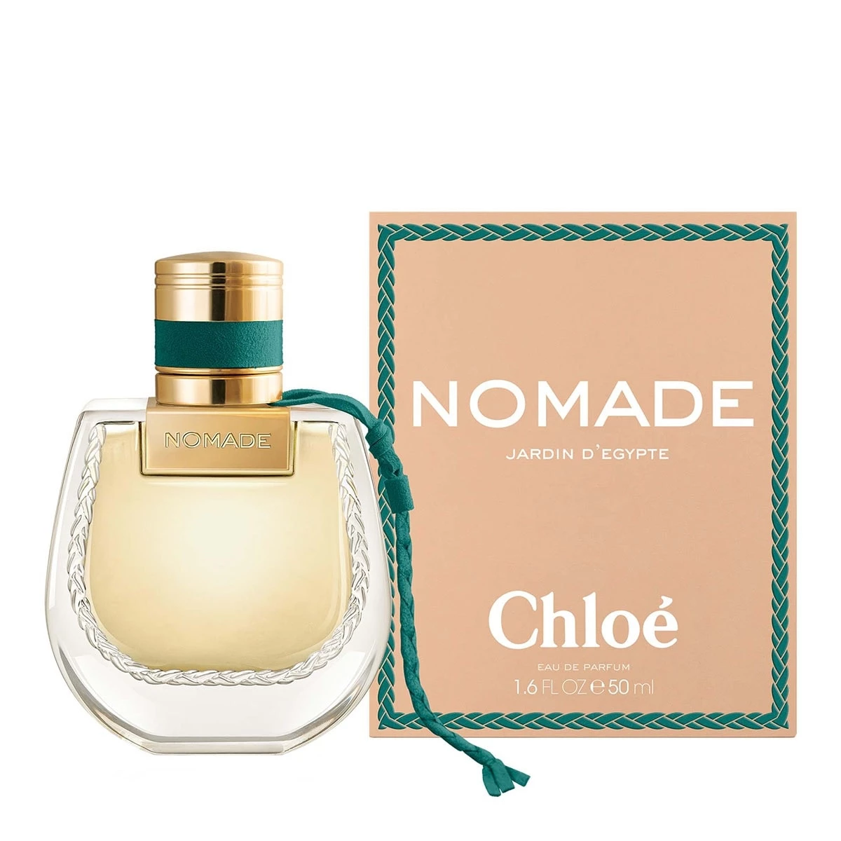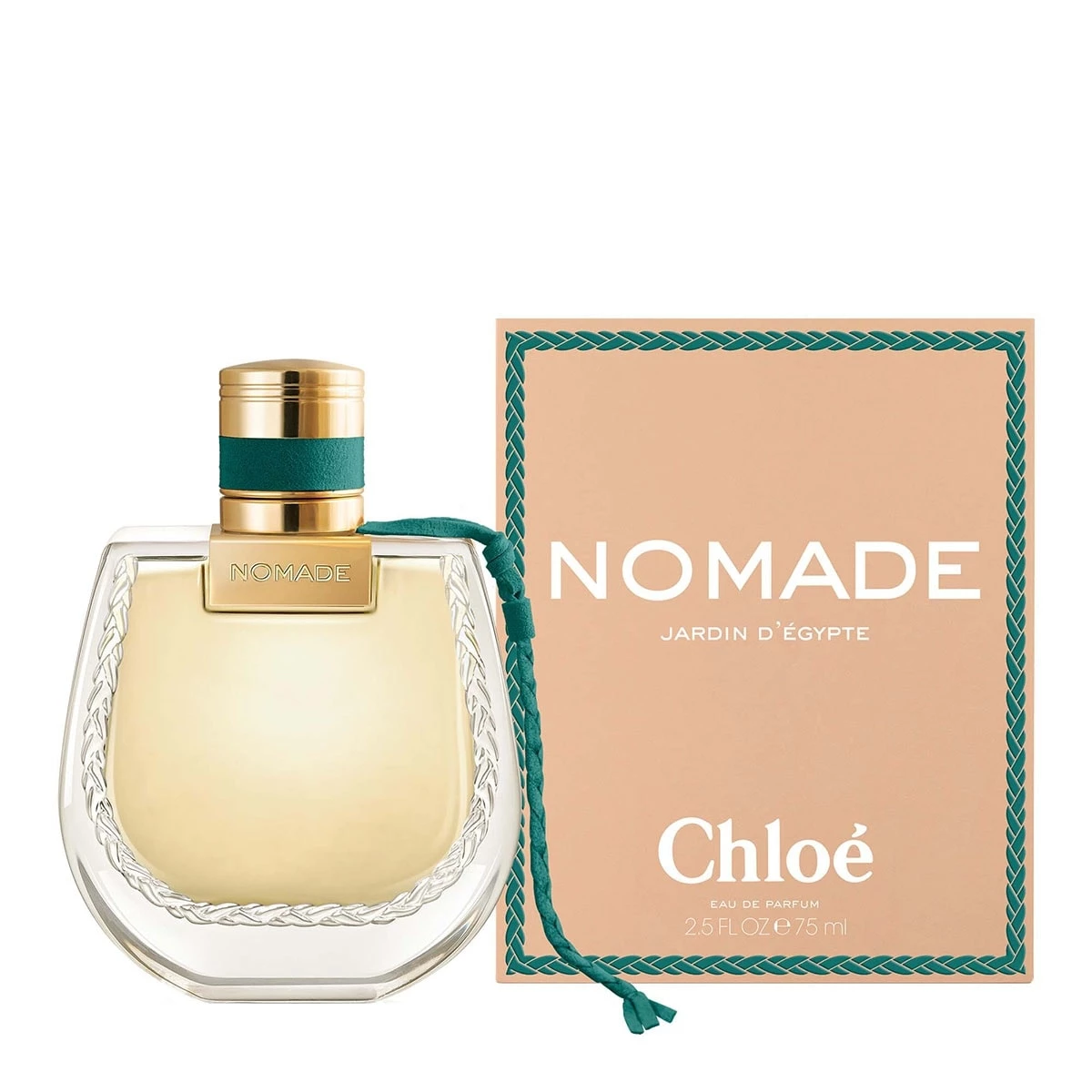 Ce parfum Chloé est présenté dans le flacon emblématique de la ligne Nomade, désormais orné d’un lien vert éclatant, clin d'œil à la couleur du papyrus égyptien.