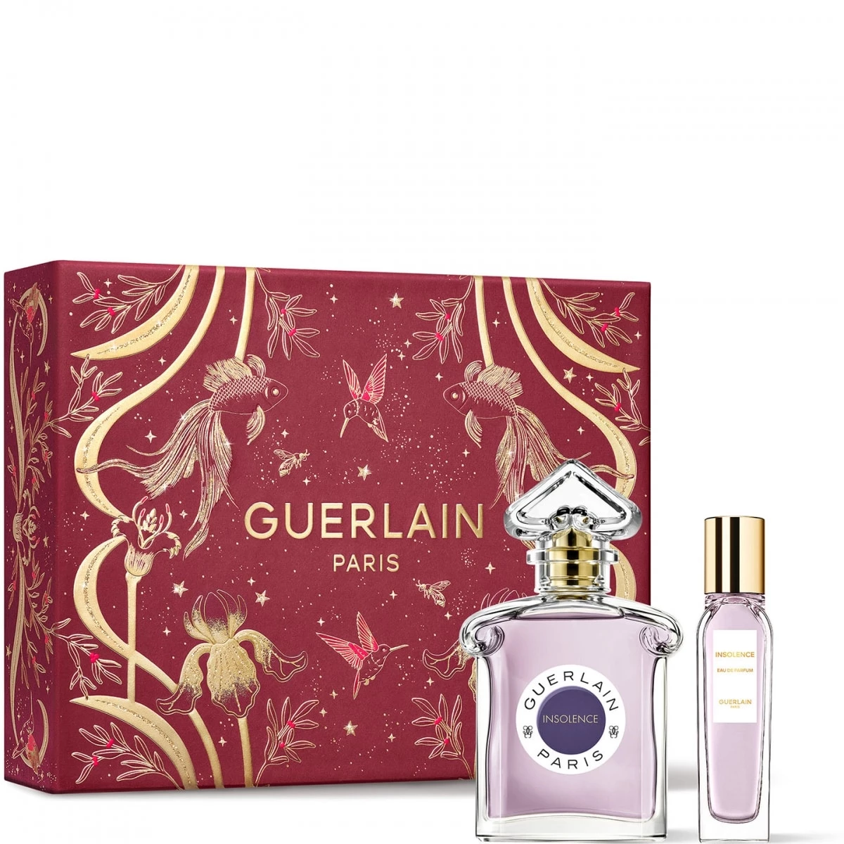 - Insolence Eau de Parfum (75 ml et un travel spray 15 ml), un sillage poudré, sensuel et audacieux. Cette fragrance florale fruitée allie les notes de fruits rouges, aux notes féminines de violette et de fleur d’oranger, ainsi qu’au luxe velouté de l’iris pour former un accord sulfureux et voluptueux.