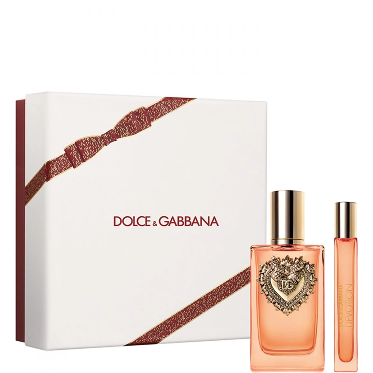 Ce coffret cadeau dégage une aura chaleureuse et raffinée, mettant en lumière les notes lumineuses et gourmandes de Devotion Eau de Parfum Intense.
