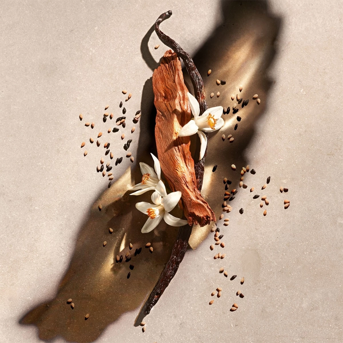 La sensualité de la vanille enlace les notes lumineuses de fleur d’oranger et l’audace inattendue du sésame grillé.