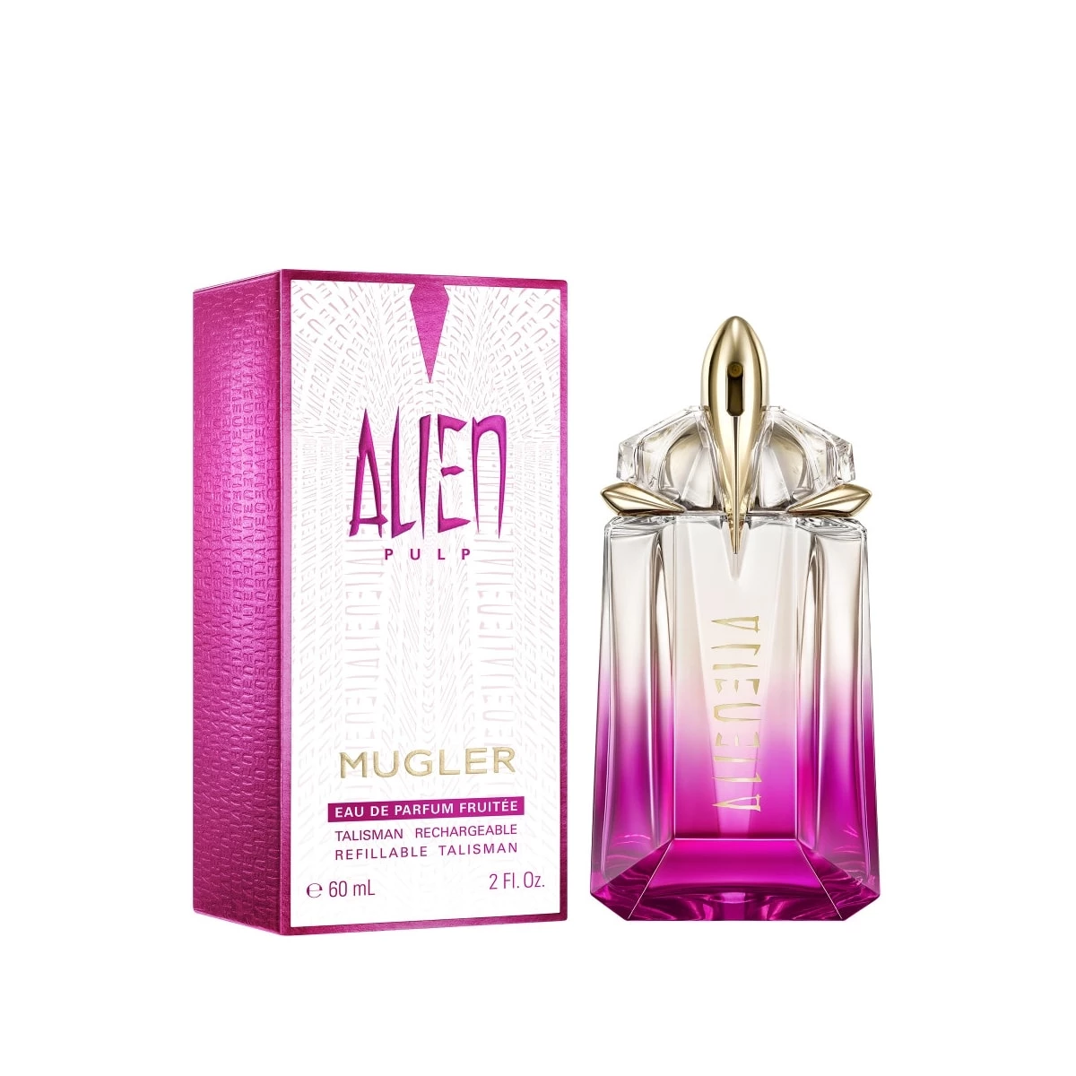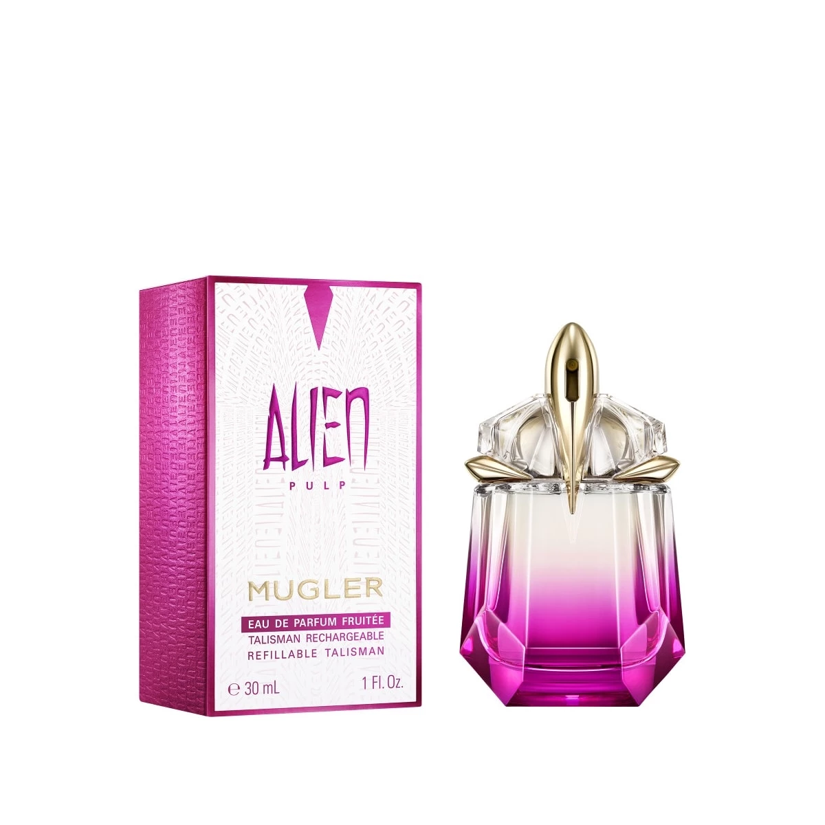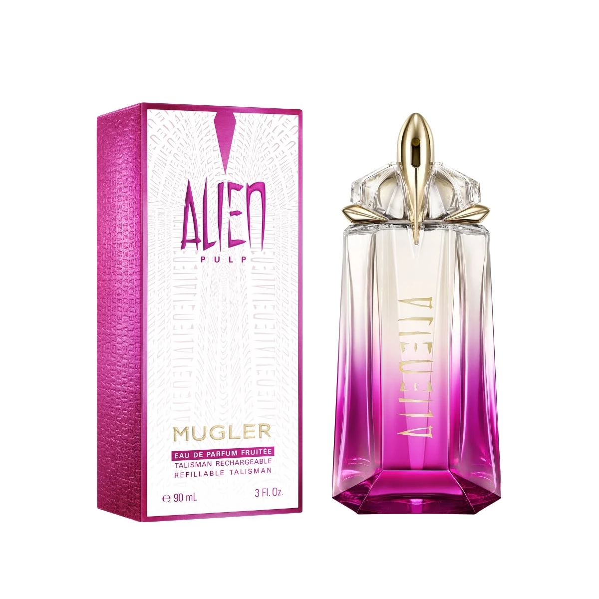 Pour vous ou pour offrir, Alien Pulp Eau de Parfum est disponible dans une gamme entièrement rechargeable en format 30 ml, 60 ml et 90 ml, grâce au flacon recharge 100 ml.