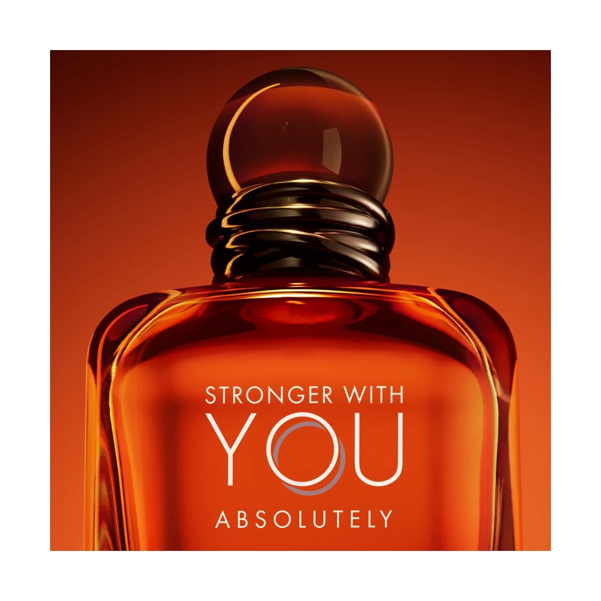 Visuellement très proche de ses ainées, l’eau de parfum Stronger With You Absolutely Armani conserve l’imposant flacon de la collection. Celui-ci est une bouteille de verre à la carrure large et robuste, évoquant une masculinité solide et rassurante. L’ensemble est adouci par un capuchon cylindrique orné d’anneaux entrelacés qui se font le symbole de l’engagement et de l’amour éternel. Pour souligner l’intensité et le caractère addictif de cette nouvelle fragrance, le flacon se pare désormais d’un laquage fumé allant d’un noir profond à une teinte ambrée d’aspect liquoreux.