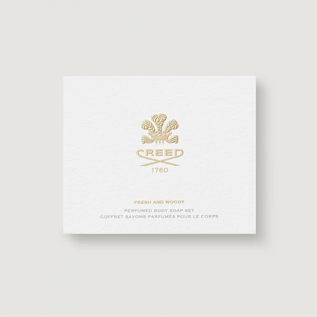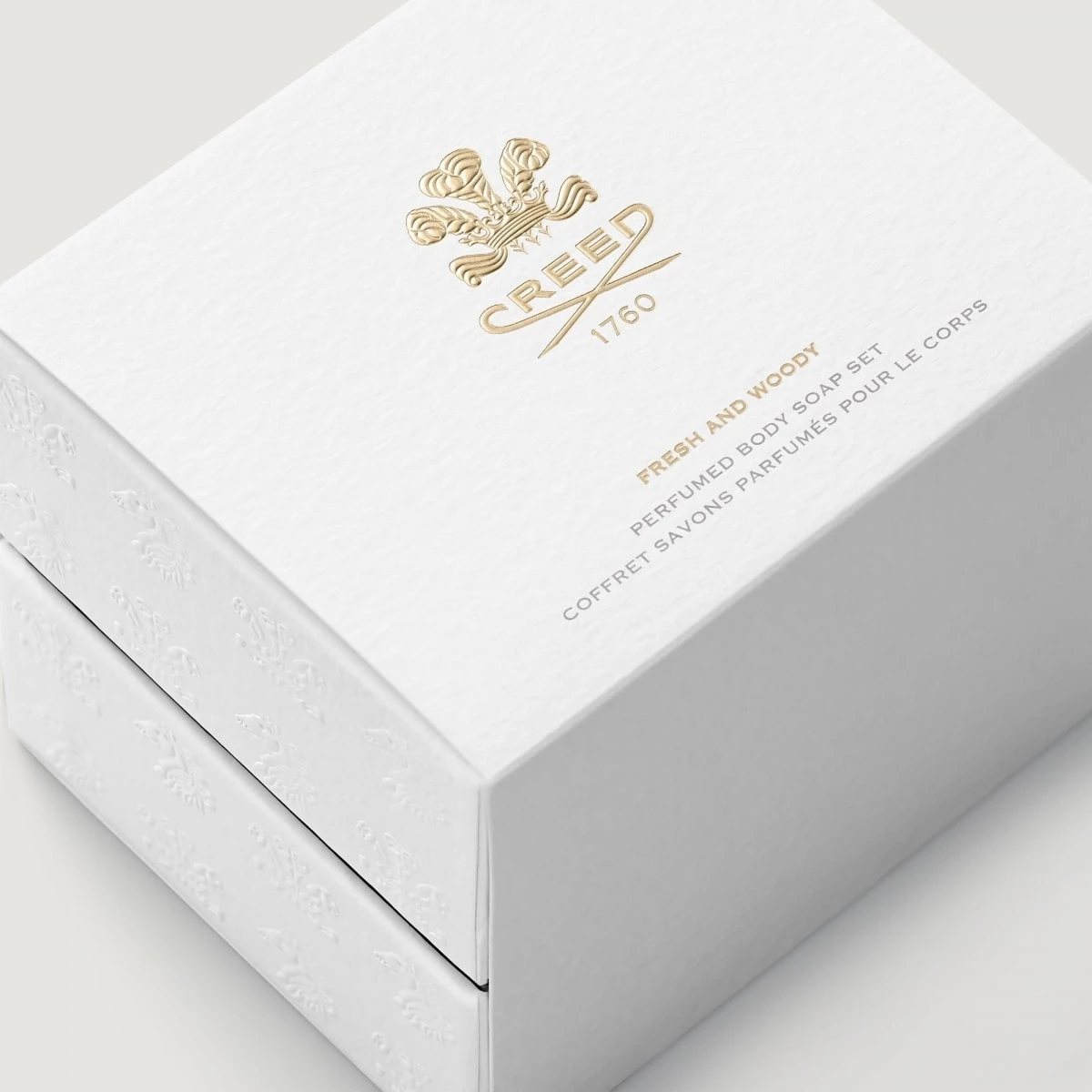 Offrez des moments de soin raffinés avec le coffret cadeau de savons parfumés Fresh & Woody, un trio de savons sélectionnés avec soin, infusés de fragrances prisées de Th eHouse of Creed: Aventus, Silver Mountain Water et Green Irish Tweed, trois cocktails de notes fraîches et boisées.