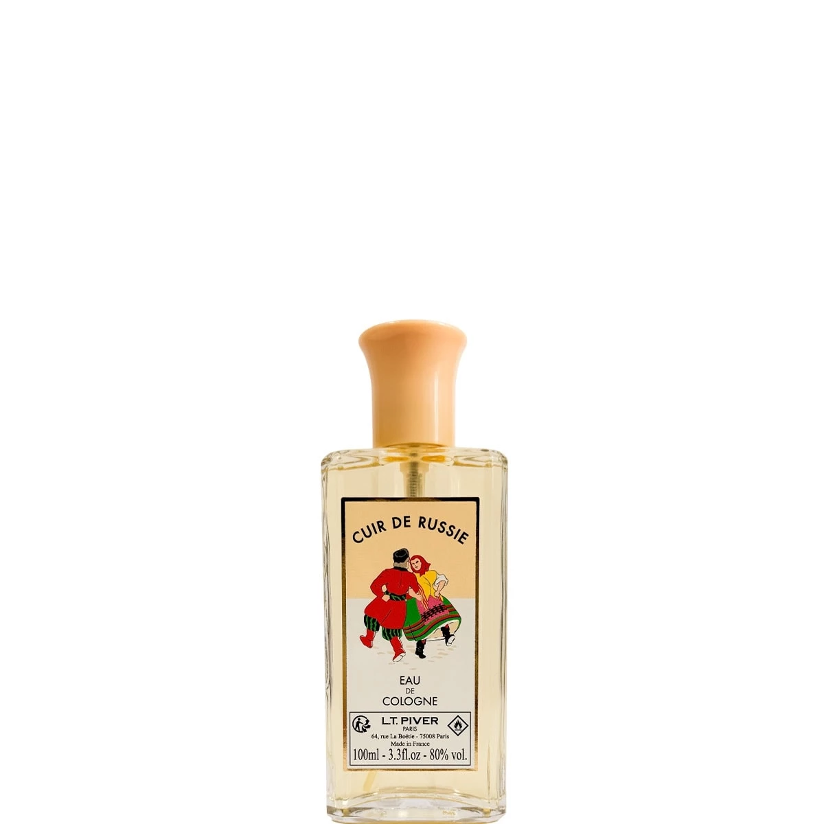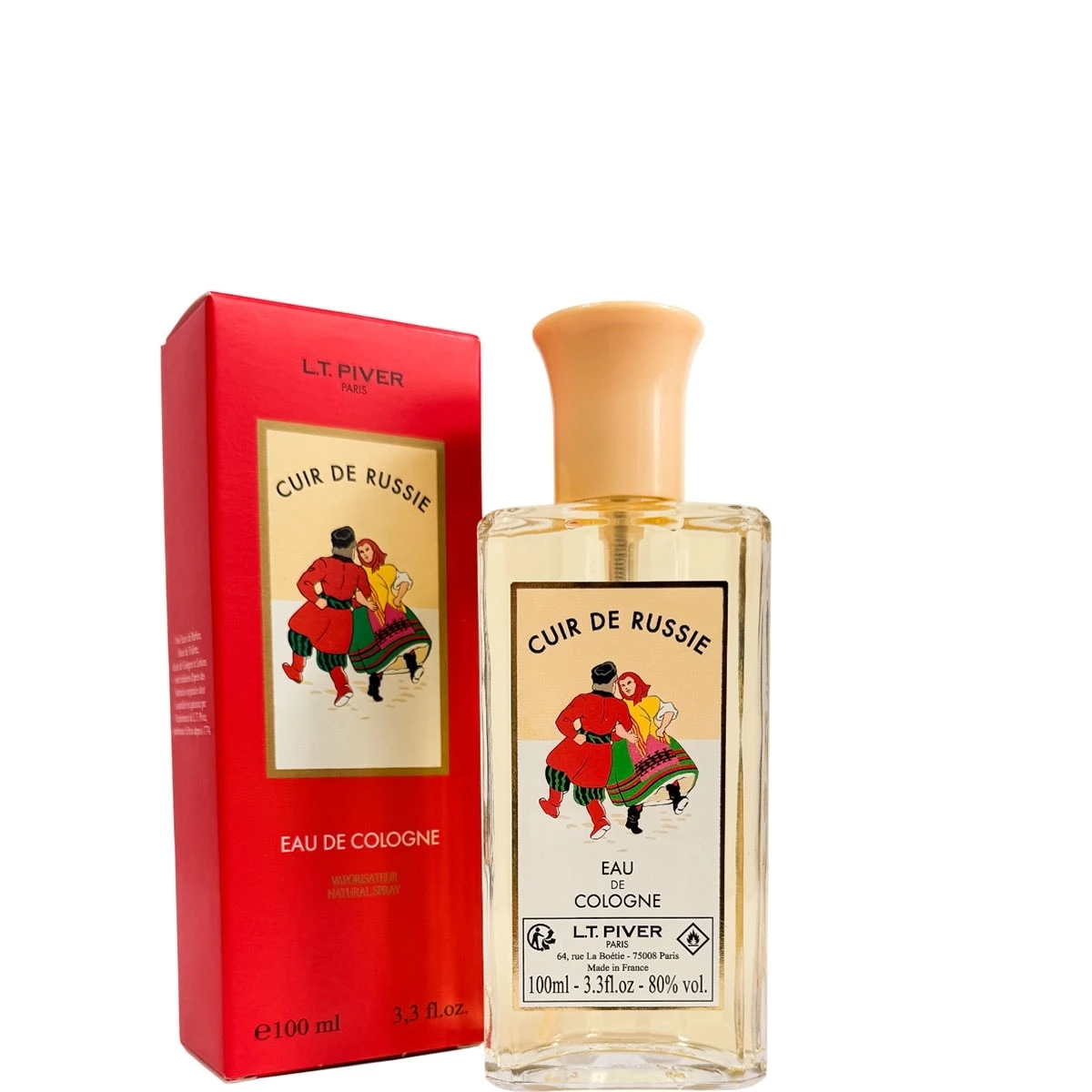Son flacon rectangulaire s’orne d’un cabochon chromé aux formes d’une toque cosaque. L’étiquette de l’eau de toilette Cuir de Russie L.T Piver demeure telle qu’au XIXe. Elle évoque la Russie et le cuir des bottes frottées contre l’écorce des bouleaux.