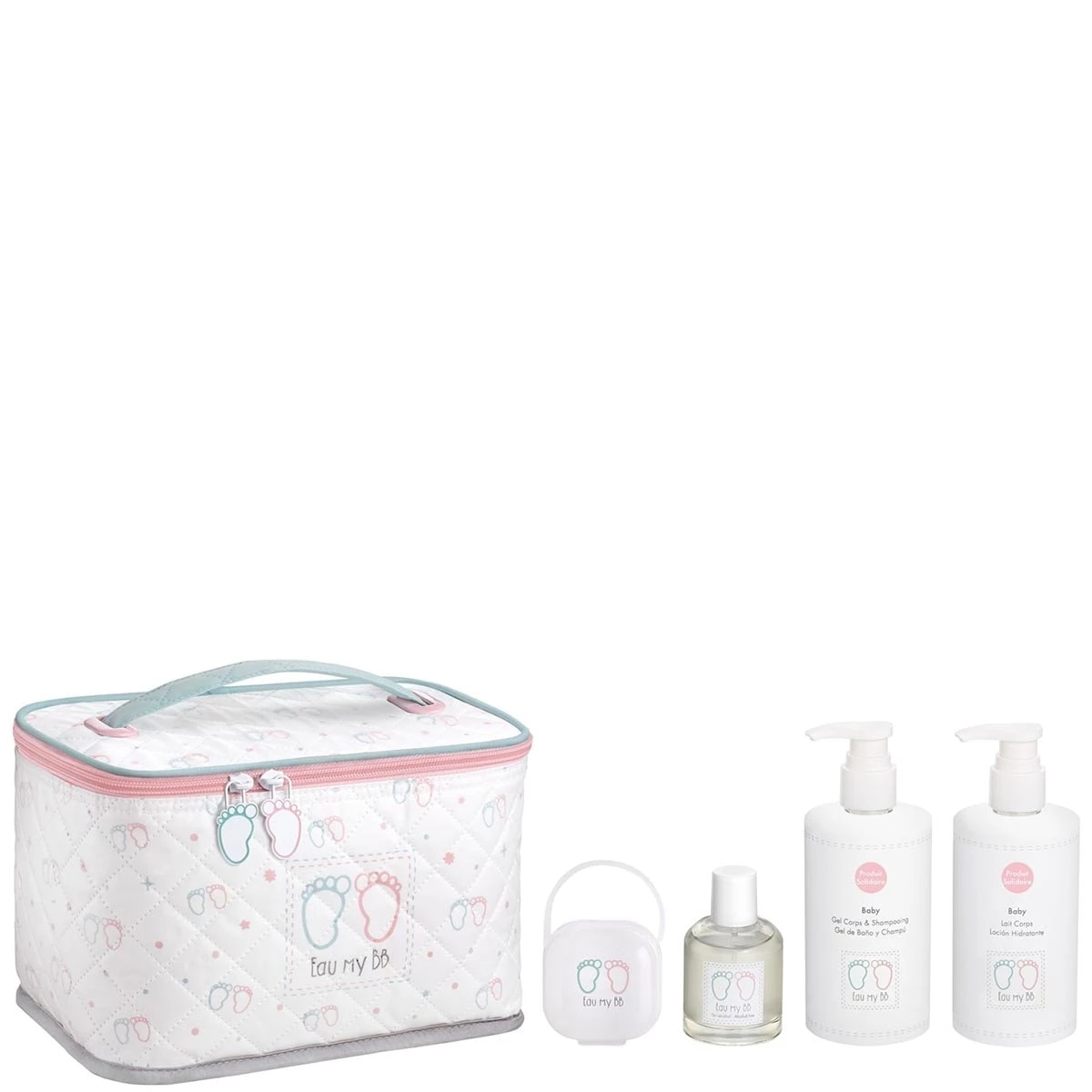 Au sein d'une adorable vanity, se nichent une eau de senteur vaporisateur 60 ml, un gel bain et shampooing 300 ml, un lait hydratant 300 ml ainsi qu'un porte tétine.