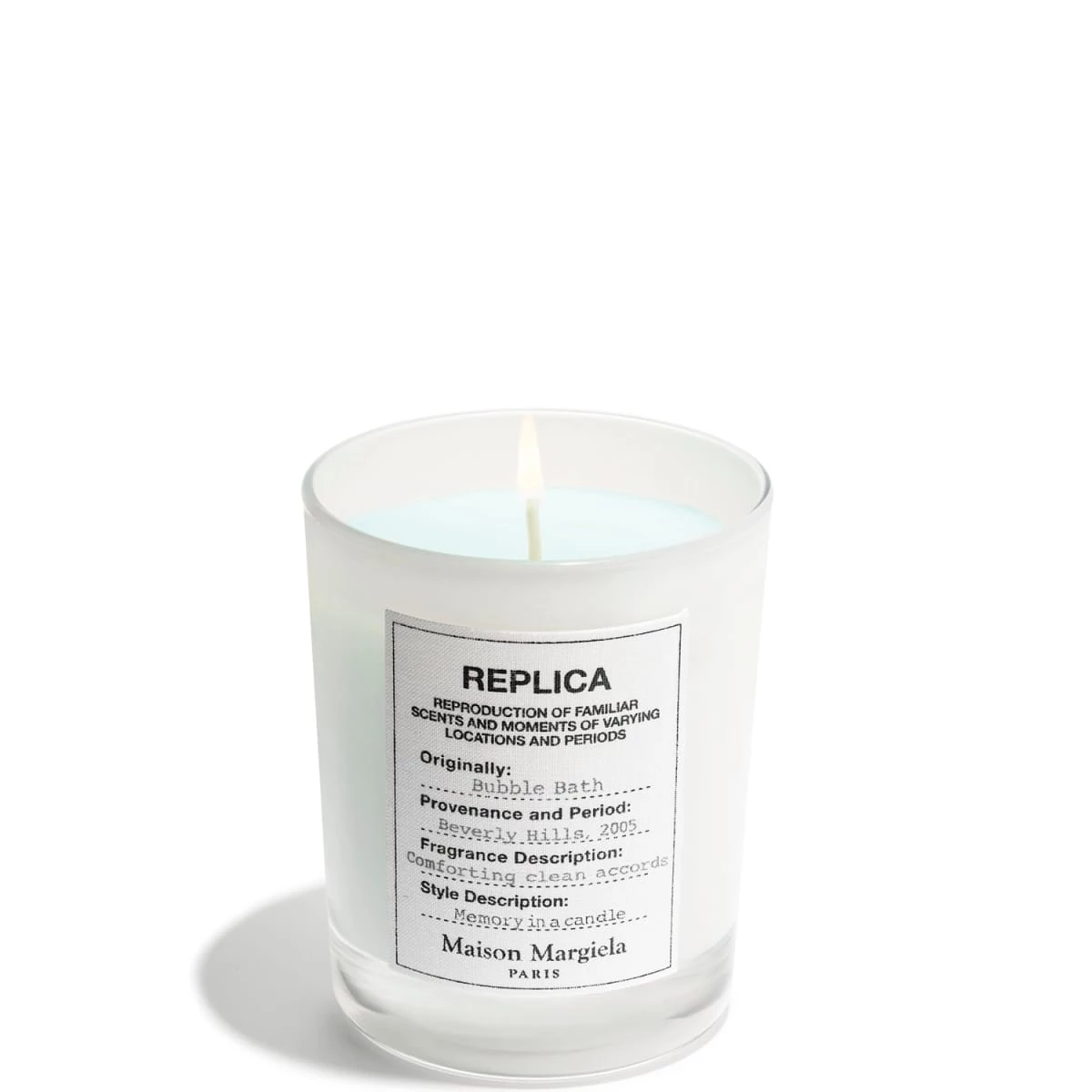 La bougie Bubble Bath est à la fois parfumée et décorative pour votre intérieur avec son précieux verre blanc orné de l'iconique étiquette REPLICA, emblématique de Maison Margiela.