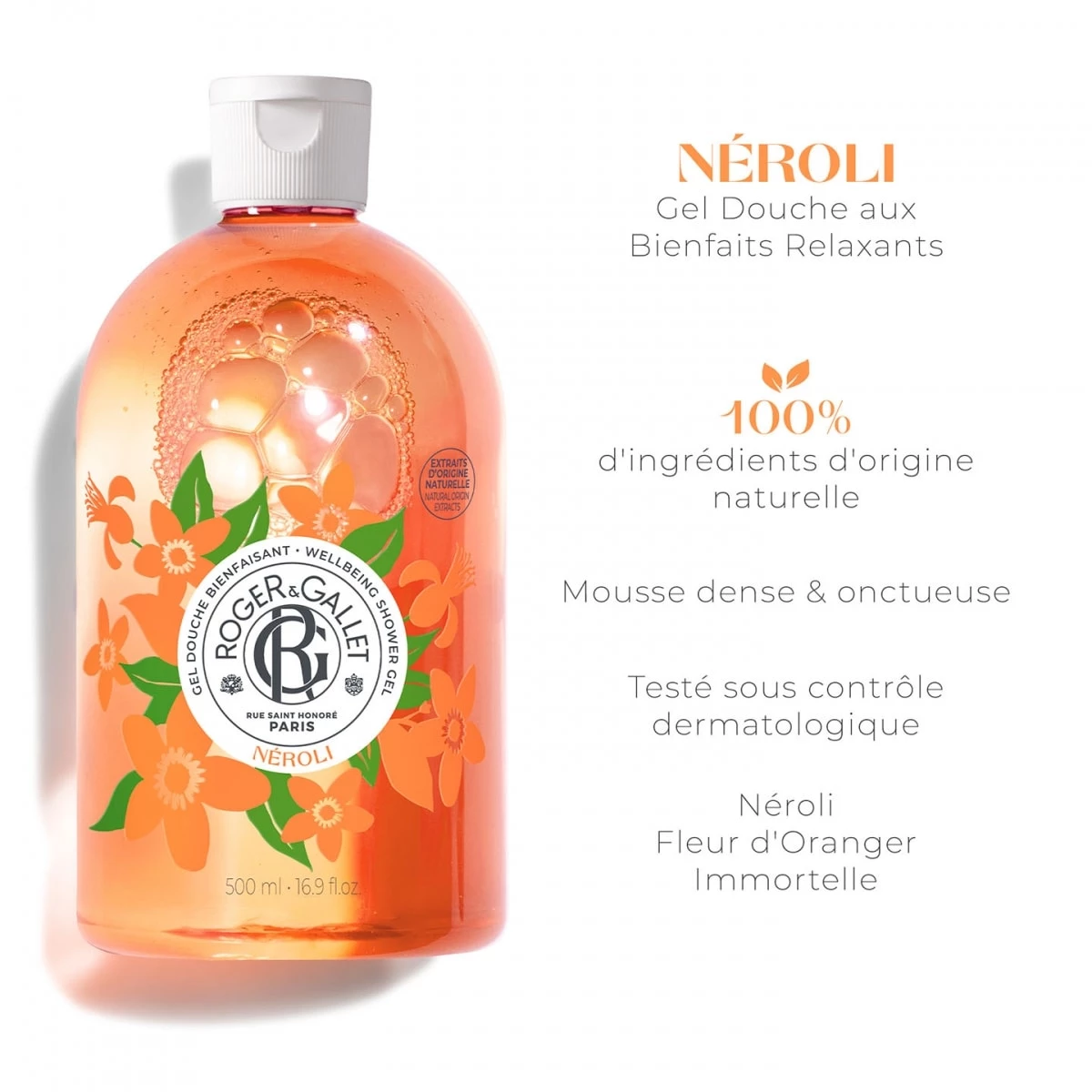 Le Gel Douche Bienfaisant Néroli à la mousse onctueuse nous invite à un bain de soleil révélant les effluves miellées et lactées de la fleur d'oranger.