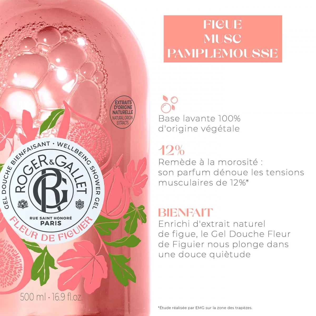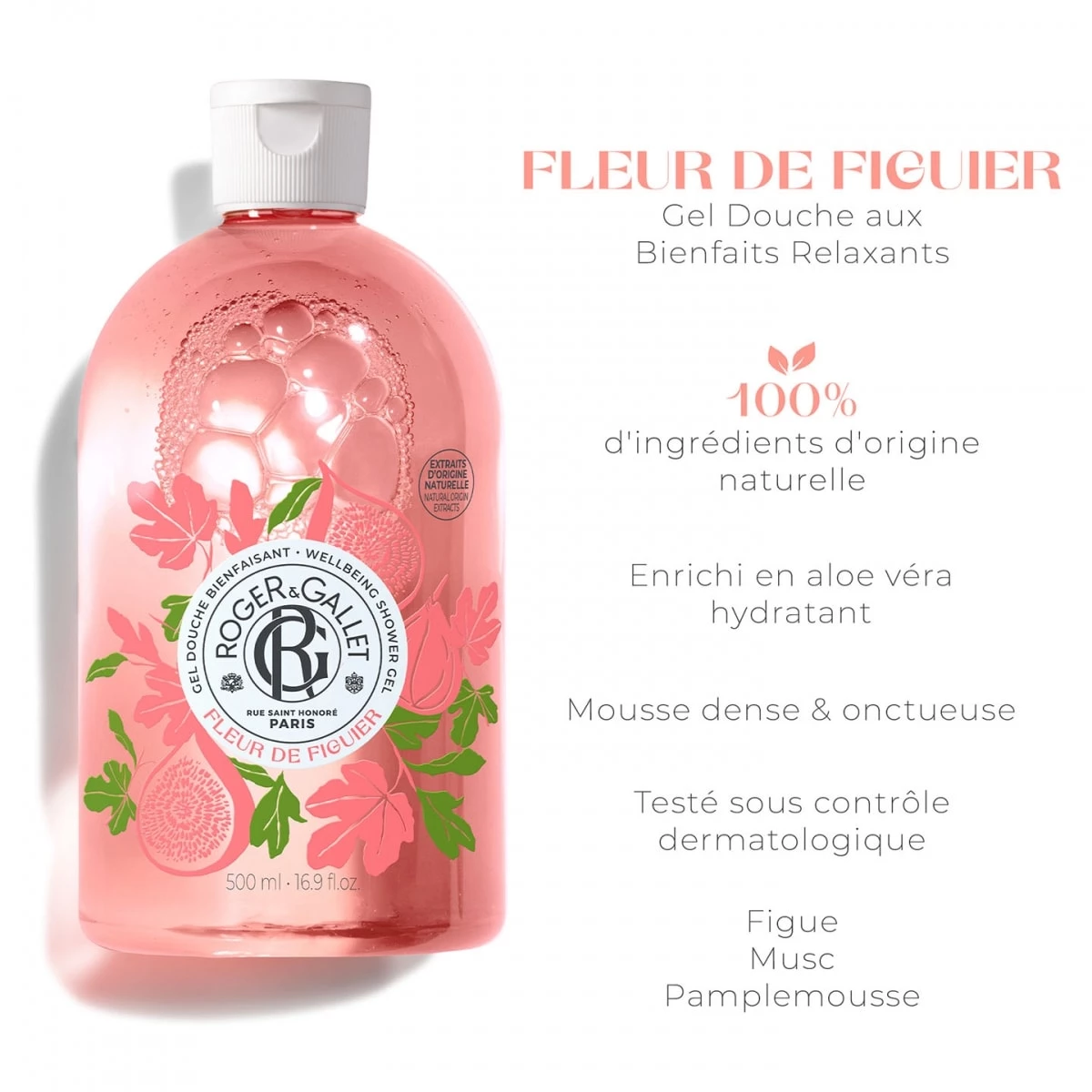 Enrichi d'Extrait naturel de figue aux vertus relaxantes et d'aloe vera, sa base lavante est 100% d'origine végétale pour une application ultra-douce pour la peau et facile à rincer.