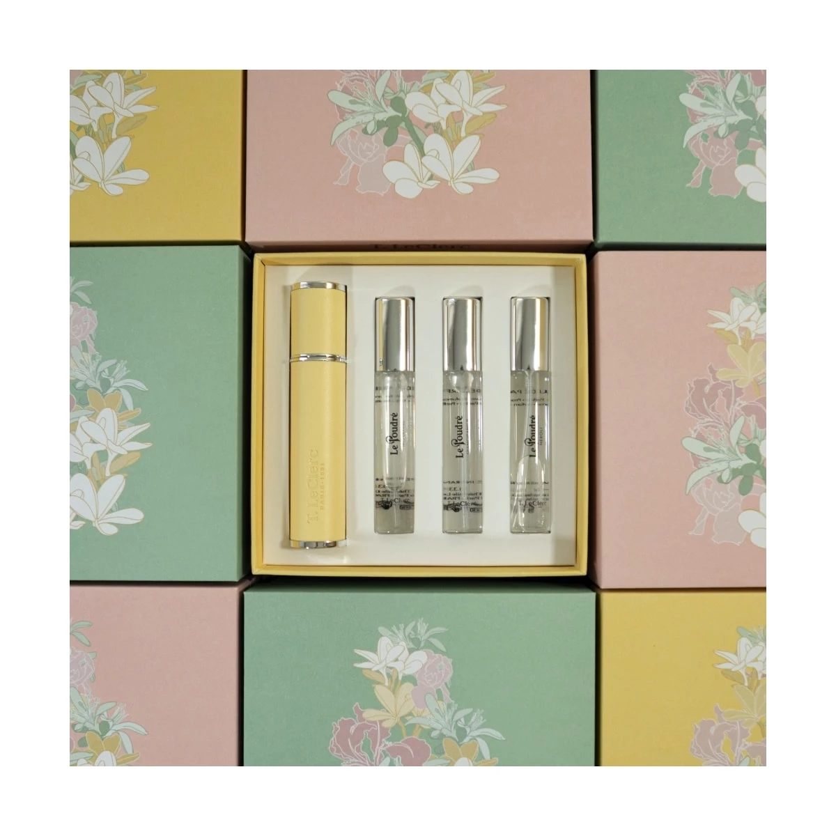 Ce coffret se compose d'un vaporisateur rose et de trois flacons 10 ml pour découvrir la collection Le Poudré :