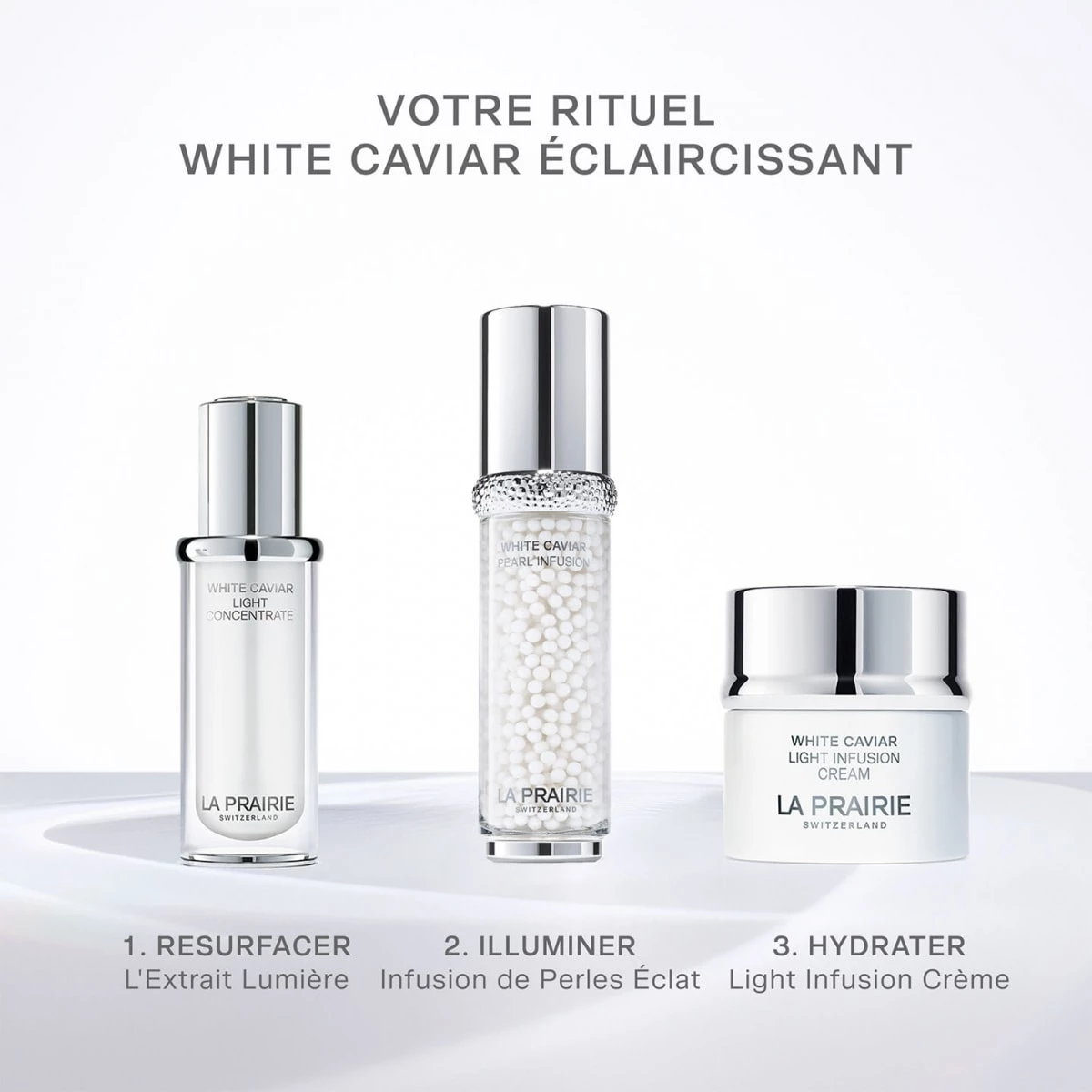 - Poursuivez avec White Caviar Infusion de Perles Éclat et White Caviar Light Infusion Crème. Laissez absorber complètement. Le matin, poursuivez avec une protection UV.