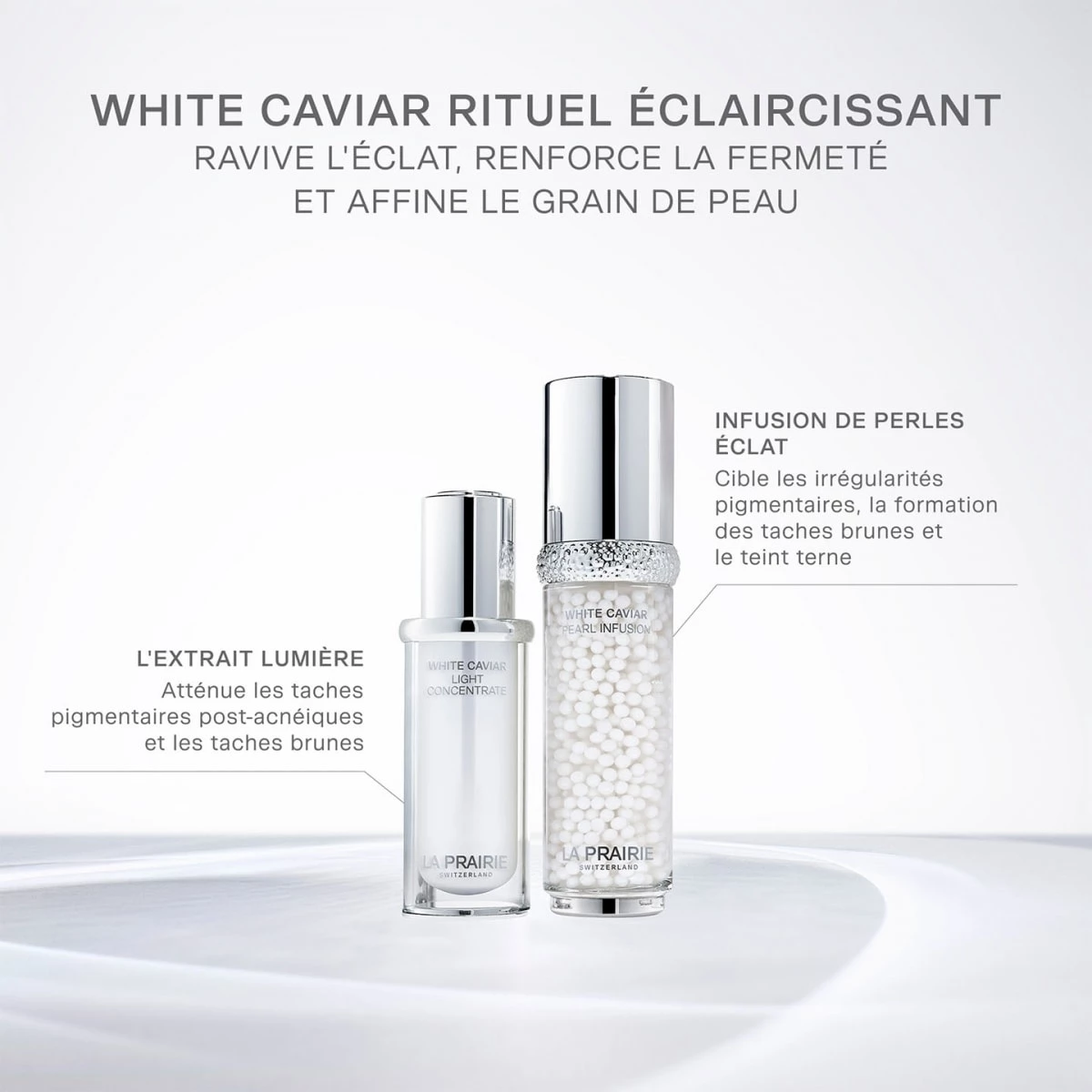 Découvrez nos soins éclaircissants d'exception, White Caviar Infusion de Perles Éclat et White Caviar L'Extrait Lumière, accompagnés d'un sérum au format découverte offert pour cibler efficacement le teint terne.