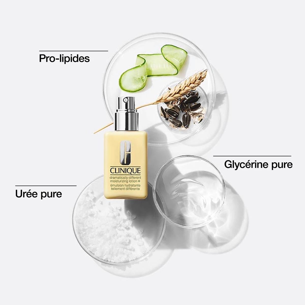 La formulation de la lotion Clinique Dramatically Different Moisturizing lotion+ renforce la barrière cutanée de 54%, améliorant ainsi la capacité de la peau à recevoir et retenir l’hydratation tout au long de la journée. Les graines de tournesol, l'extrait d'orge et l'extrait de concombre améliorent la résistance naturelle de la peau et l’aide à s’équilibrer afin de maintenir un niveau d’hydratation optimal. L'acide hyaluronique agit comme un humidificateur naturel permettant de repulper la peau.