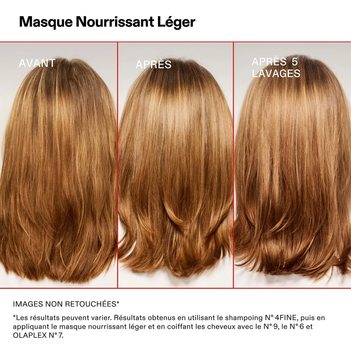 Il est formulé avec la nouvelle technologie OLAPLEX Biomimetic Cuticle Technology™ pour hydrater sans alourdir et sceller les cuticules des cheveux pendant 5 lavages.
