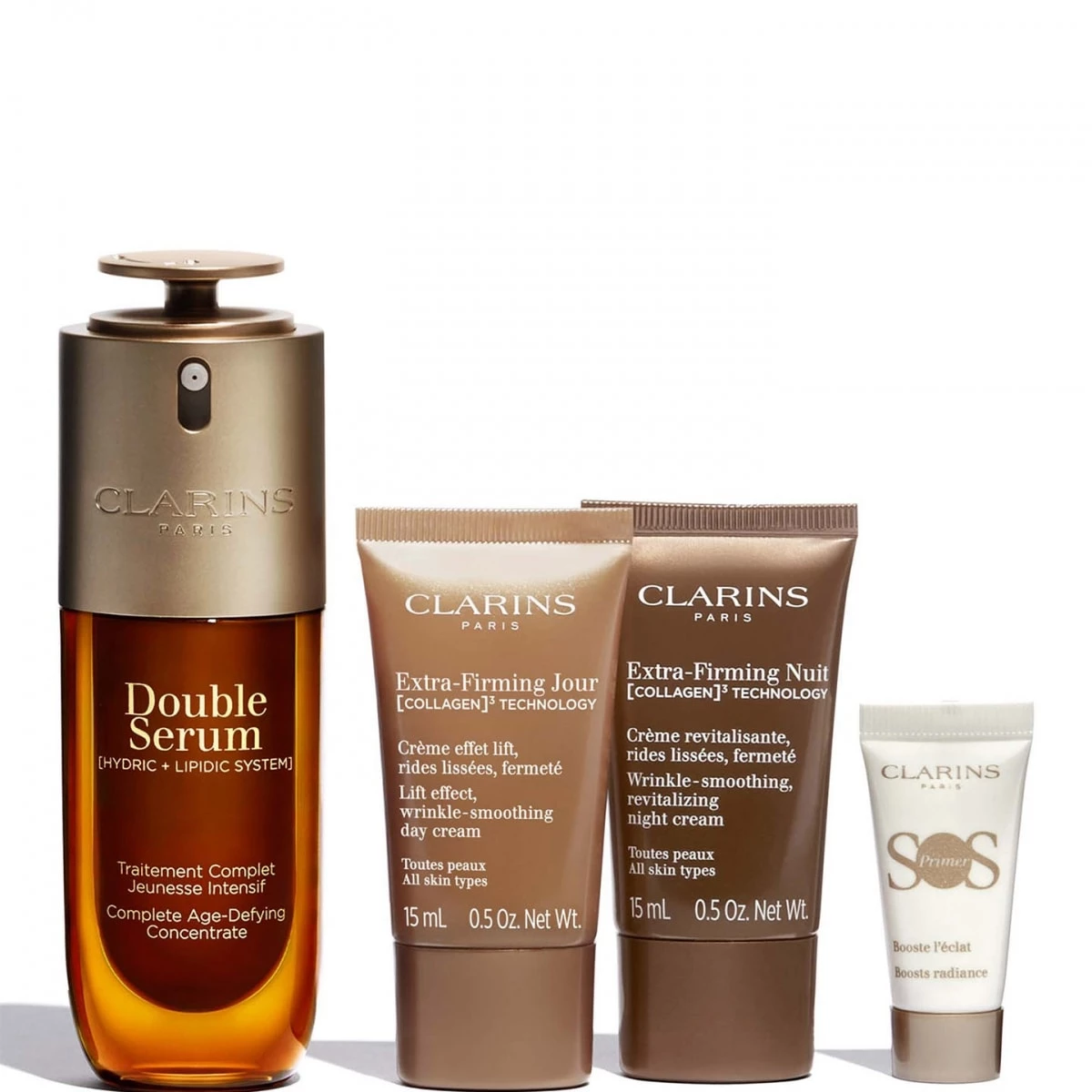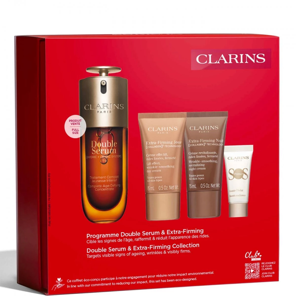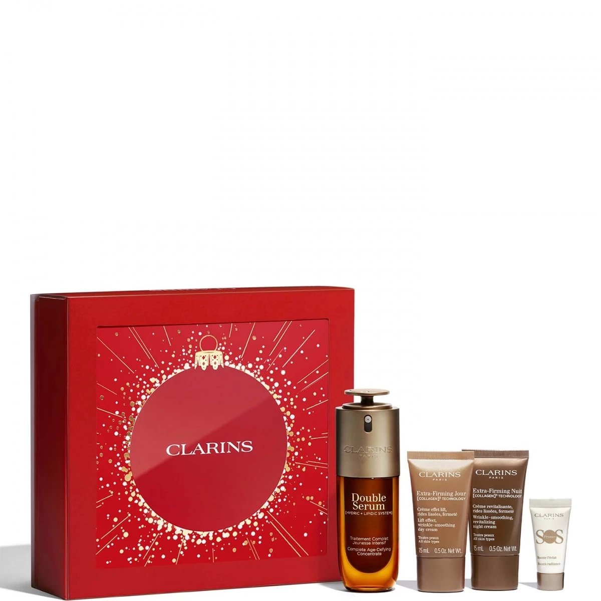 Ce coffret de soins experts est dédié à celles qui veulent une peau d'apparence plus jeune, plus lisse, comme liftée : d'abord l'iconique Double Serum nouvelle génération, traitement complet pour cibler les différents signes de l'âge, vrai rituel jeunesse qui vous donne une peau raffermie, rebondie et plus éclatante. Complétez votre routine effet lift avec le duo Extra-Firming Jour & Nuit et sa [COLLAGEN]3 TECHNOLOGY pour aider à améliorer la fermeté de la peau.