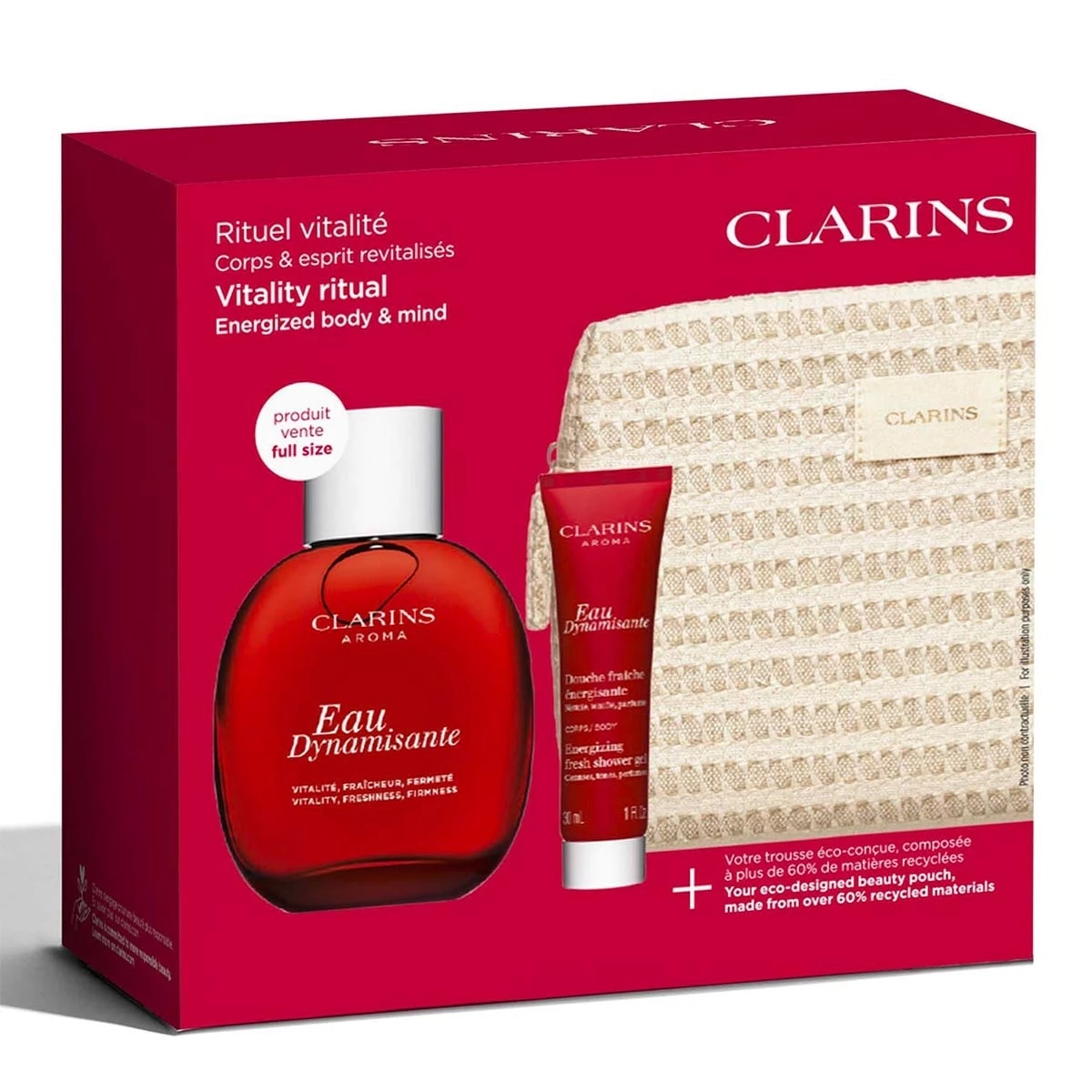 Ce coffret réunit l'iconique Eau Dynamisante, la toute première Eau de Soins Clarins et son gel douche.
