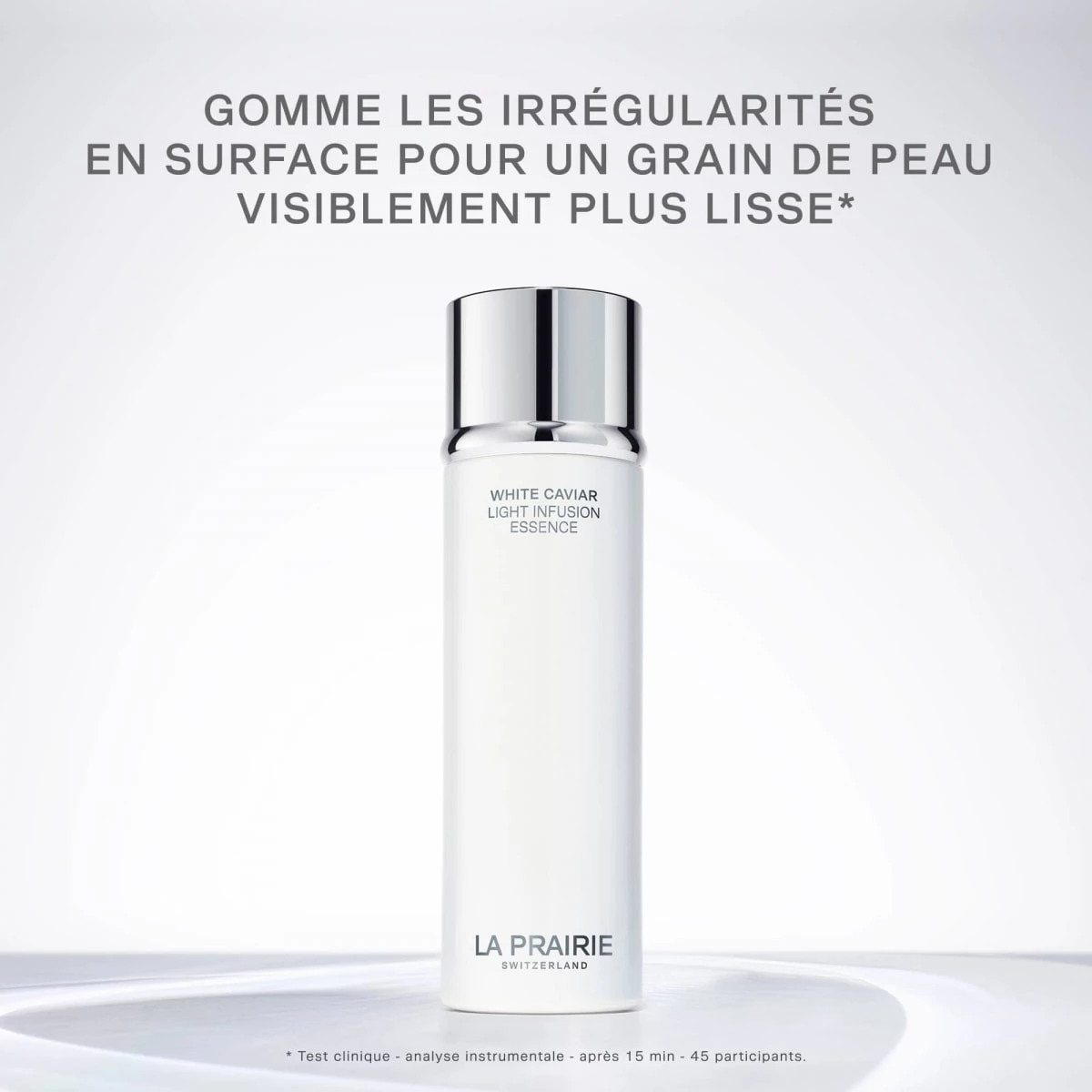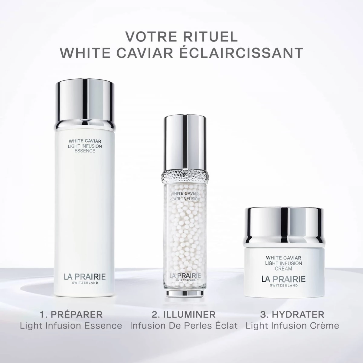 - Appliquez ensuite un soin pour le contour de l'œil, un sérum visage et un soin hydratant de la collection White Caviar de La Prairie.