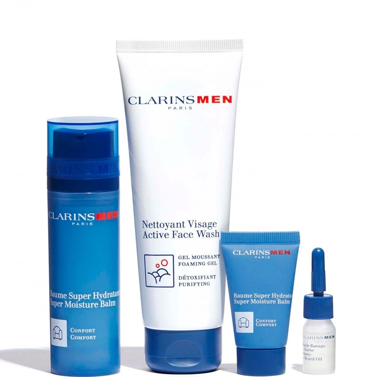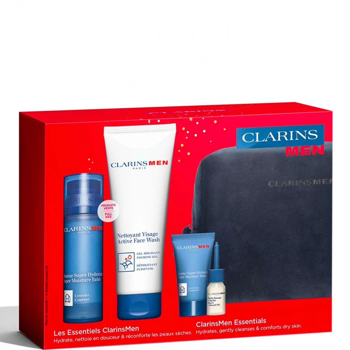 Une jolie trousse bleue ClarinsMen contient tous ces soins, composée à 88% de fibres recyclées.