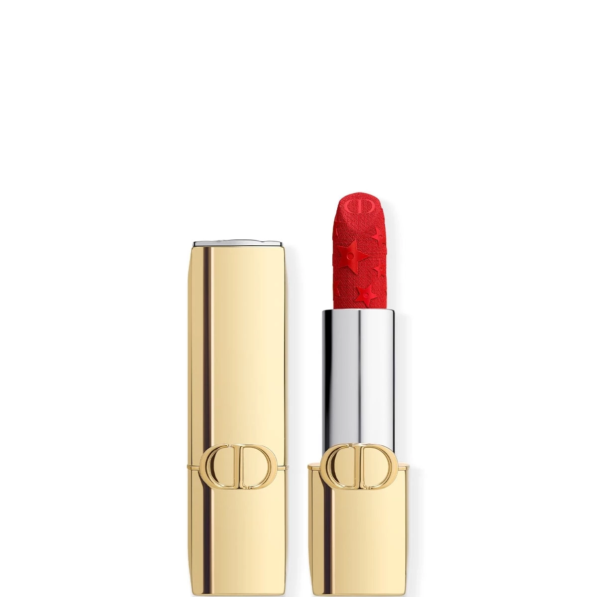 Pour les fêtes de fin d'année, Rouge Dior, le rouge à lèvres iconique, revêt, un écrin entièrement doré, tandis que son raisin est minutieusement gravé d'étoiles.