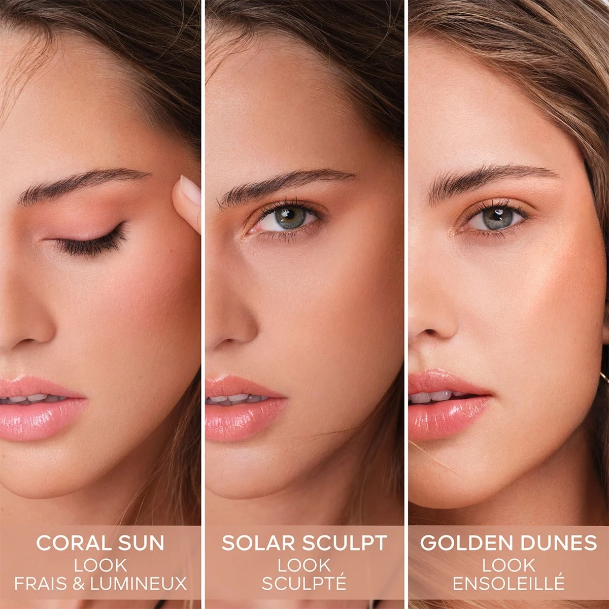 - Pour un look ensoleillé, appliquer le blush au niveau des pommettes et sur les paupières. Intensifier l’effet ensoleillé avec les teintes bronzantes au creux des joues, sur le front et au niveau de la mâchoire. Appliquer l’enlumineur sur les points de lumière : en haut des pommettes, en coin interne de l’œil et sur l’arcade sourcilière.