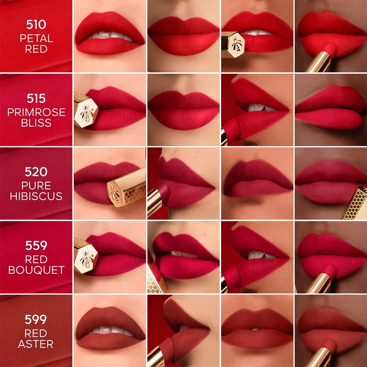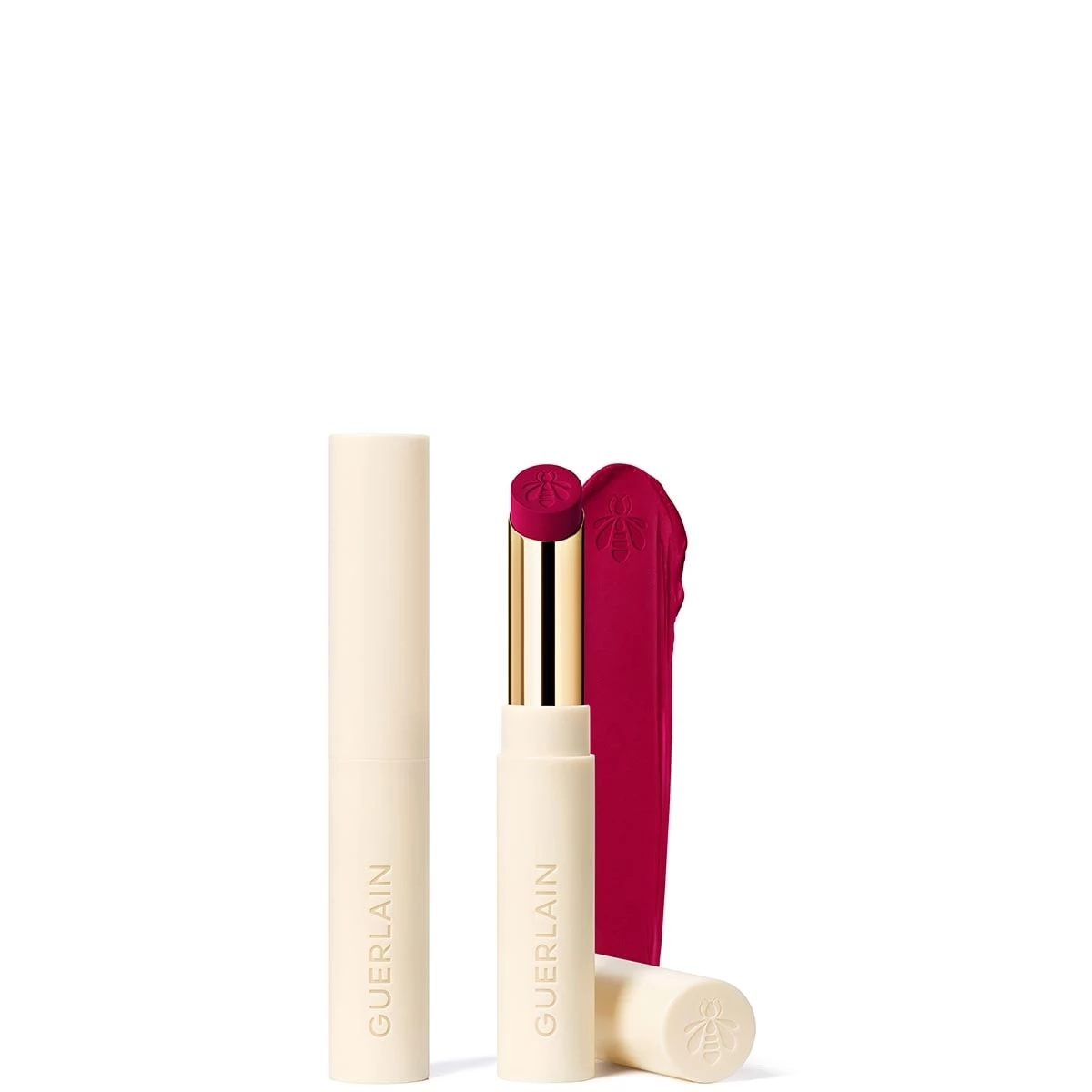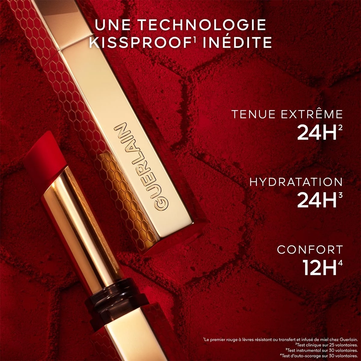 Les laboratoires de recherche Guerlain ont mis au point une technologie inédite¹ pour ce nouveau KissKiss : les actifs soins issus de la ruche s’associent à un duo de polymères assurant un résultat maquillage impeccable et une longue tenue avec un minimum de transfert.
