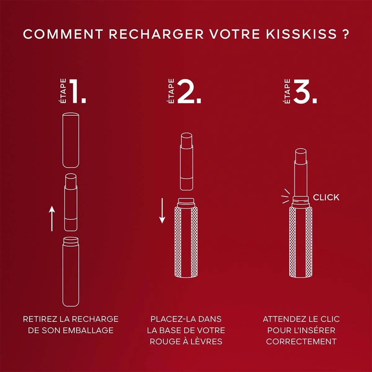- Pour recharger votre KissKiss, retirez la recharge de son packaging et insérez-la dans la base de l’écrin KissKiss.
