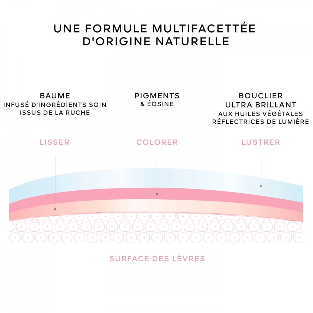 Des huiles végétales réflectrices de lumière forment ensuite un film à la surface des lèvres pour sceller l’hydratation tout en apportant une brillance 3D irrésistible.