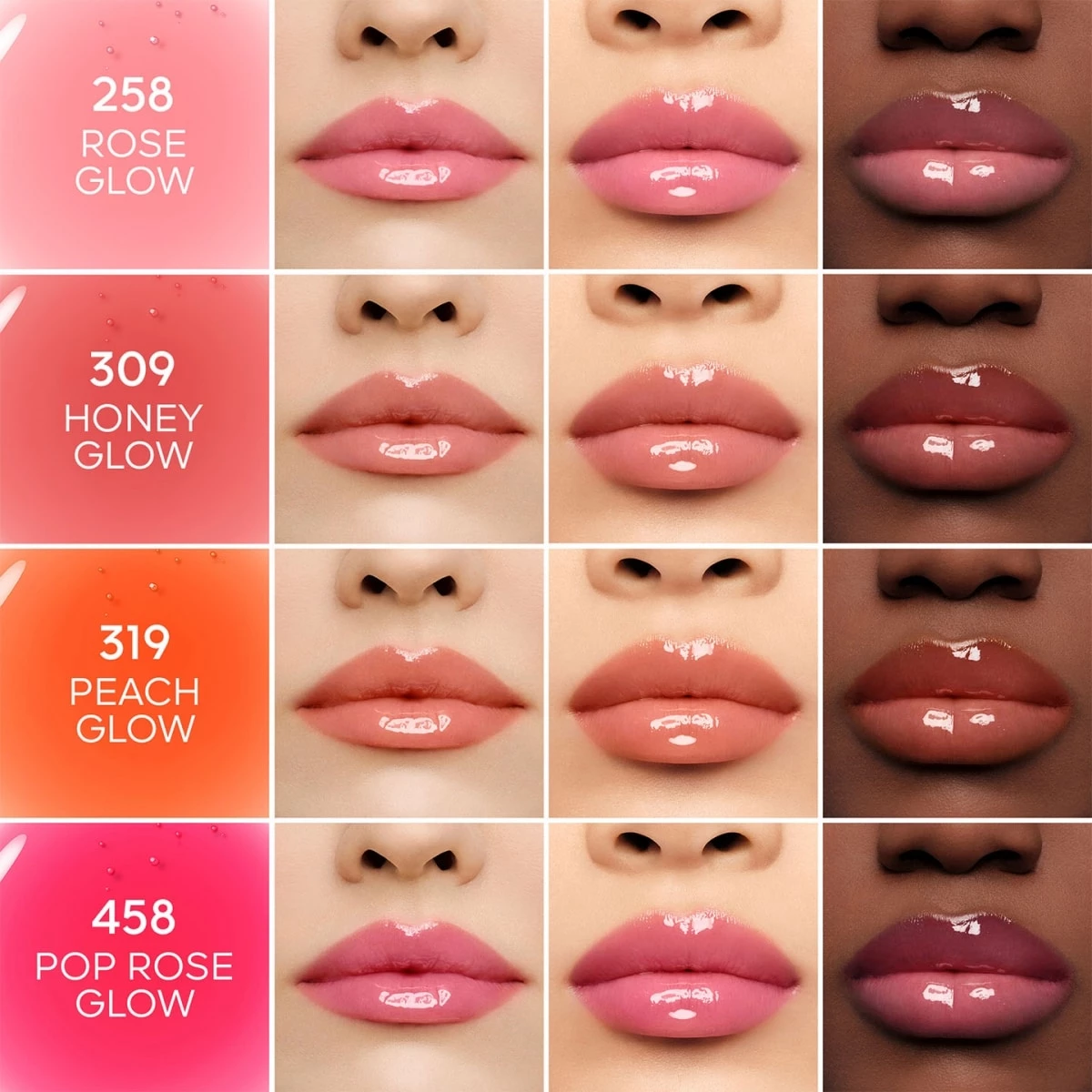 KissKiss Bee Glow Oil est proposé en 6 teintes sirop qui vont de pair avec celles du baume-soin coloré KissKiss Bee Glow, dont ses 3 tonalités-stars :
